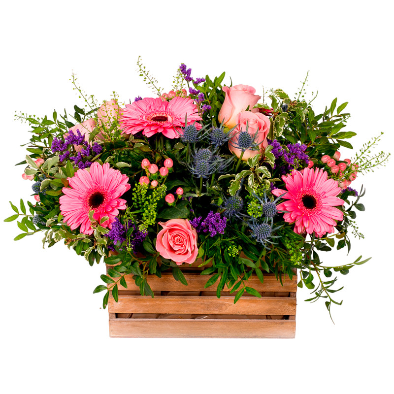 Caja decorativa en tonos rosáceos y morados, compuesta por diversos tipos de flores y verdes tales como rosas, gerberas, eryngium, hypericum, pitosporino y lentisco.