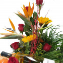 Espectacular composición mezclando flores, frutas y botella de vino blanco Circe. Un original, fresco y sabroso regalo que combina flores tales como rosas, esterlicias, girasoles y frutas de temporada. El stock de frutas dependerá de la estación del año.