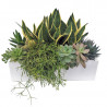Jardinera rectangular compuesta por diferentes tipos de plantas suculentas de diferentes tonos y variedades, acompañadas de plantas de sansevieria. Un original regalo que perdurará en el tiempo. Medidas aproximadas 50x50 cm.