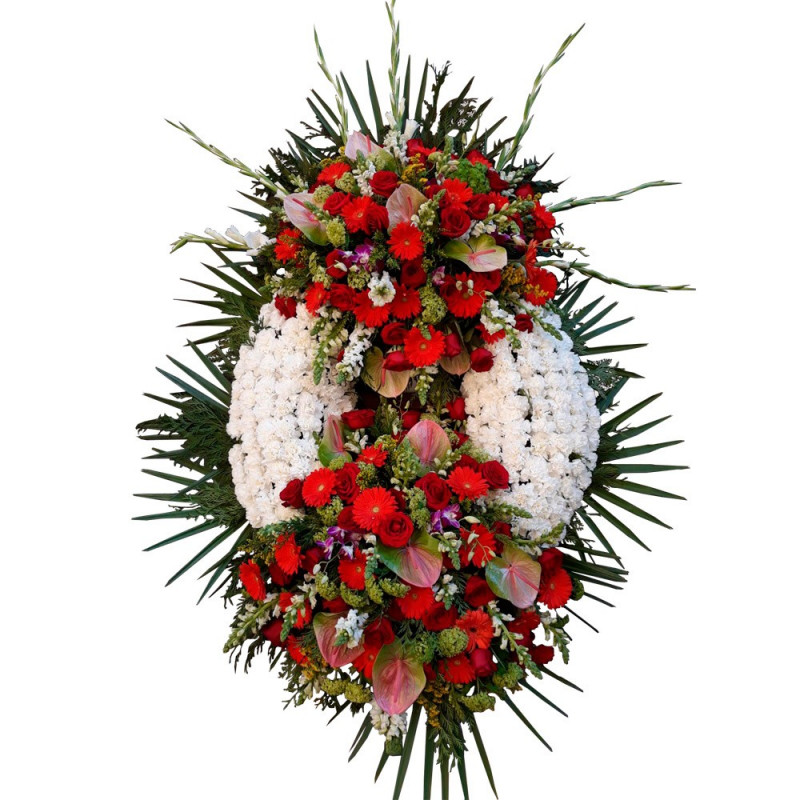 Corona de 2 cabeceros, en tonos rosas, rojos, verdes y blancos, compuesta de flores tales como gladiolos, anthurium, rosas y gerberas, sobre base de claveles. Diámetro aproximado 90 cm. Incluye cinta personalizada.