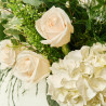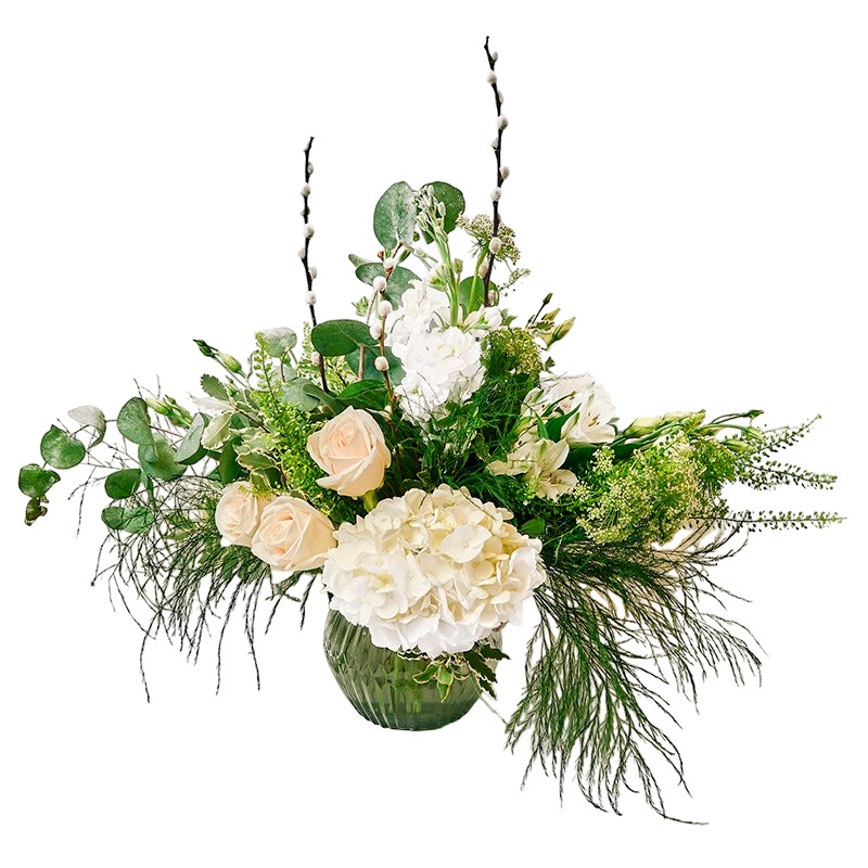Pequeño jarrón compuesto por diferentes flores en tonos blanco y verdes ornamentales que dará elegancia y distinción en cualquier lugar. Incluye flores tales como rosas, hortensias, alstromelias, etc.