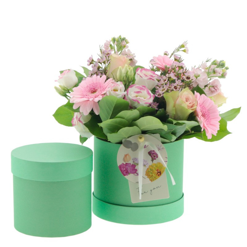 Original sombrerera verde pastel que incluye composición floral en tonos rosas y blancos con flores tales como rosas, gerberas, lisiamtum, flor de cera, etc., así como diversos verdes variados. Medidas aproximadas 25x25 cm.